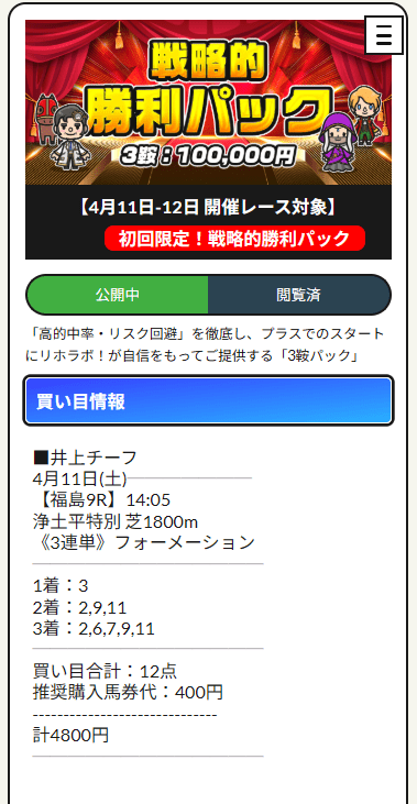 新規向けの勝利パックって聞くと、どうしても無難にまとまった情報を想像しがちなんですけど、リホラボの勝利パックはそこが違いました。1番人気を頭で使いながらも、2着と3着で6番人気、7番人気まで連れてきて、配当総額は48万1160円。ここがすごく大事で、本命を頭にしたからといって薄く終わってないんですよね。人気馬を信じる胆力と、相手でちゃんと荒れ目を拾う馬券力、その両方があるからこの数字になる。自分は今ちょっと大きめの買い物を先送りしてるんですが、勝利パックみたいに“堅く見えてちゃんと伸びる”情報を見ると、またやってみようかなって気持ちになります。