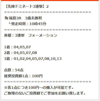 福島11Rの吾妻小富士ステークスで49万1000円、中山11Rのニュージーランドトロフィーで29万5700円。配当総額は78万6700円。